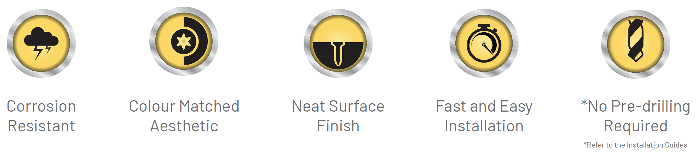 HULK Fasteners are purposefully designed to make composite or timber decking installations more efficient and straightforward by providing highly durable hidden fastener options that fit neatly into the edges of grooved boards, as well as a range of color matching top fixing screws. These fasteners are created to match the warranties of the leading composite decking boards on the market and are available in a range of colors to complement the look of your decking of choice.